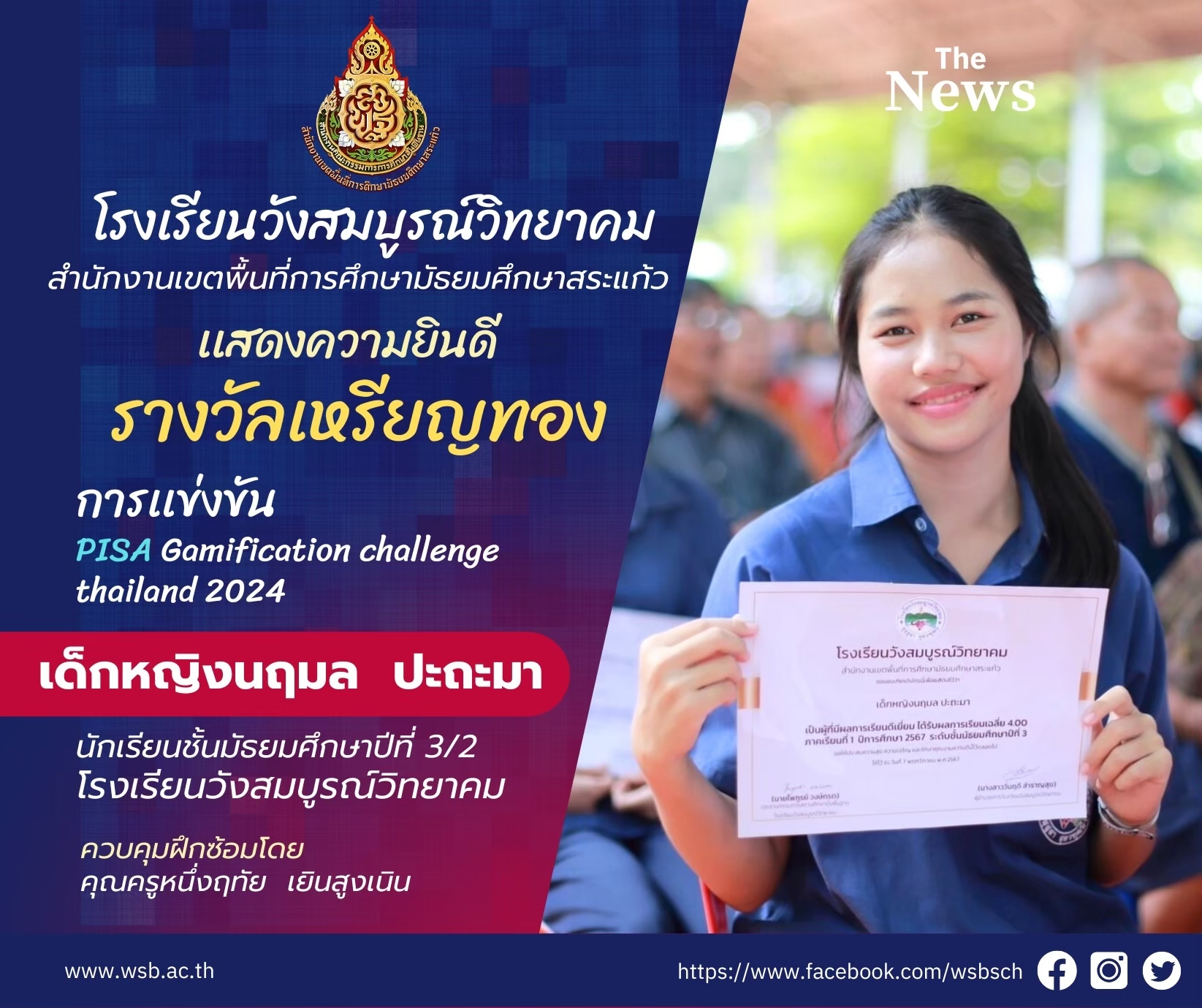 ขอแสดงความยินดี กับเด็กหญิงนฤมล ปะถะมา ได้รับรางวัลเหรียญทอง การแข่งขัน PISA สิงหาคม 4, 2025สิงหาคม 4, 2025NEWUSERNAMEข่าวประชาสัมพันธ์, รางวัลเกียรติยศ